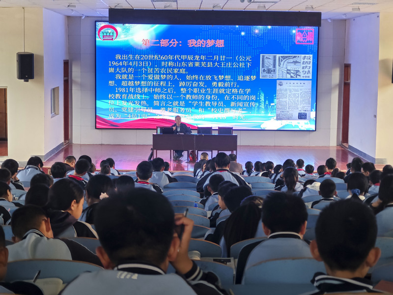 “银发生辉映初心,退而不休育新人。我们这代人的梦想,是在奋斗中照进现实的。”贺老师以自身求学经历开篇,结合泰山文化中坚韧不拔的精神内核,为同学们阐释“为何要有梦”。他提到,梦想是人生的航向灯,如同泰山的松柏扎根岩缝仍向上生长,少年人唯有树立明确志向,才能在成长路上不偏航、不松懈。